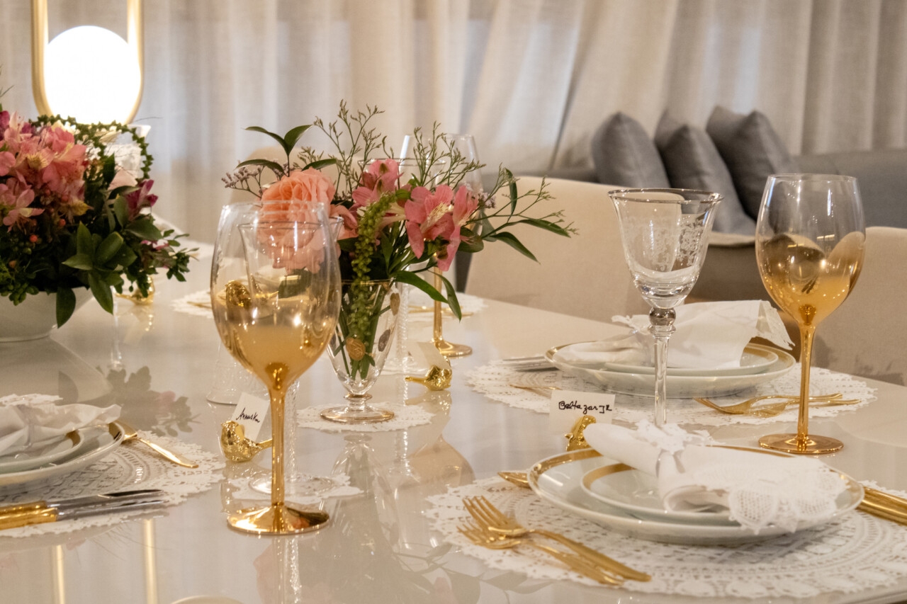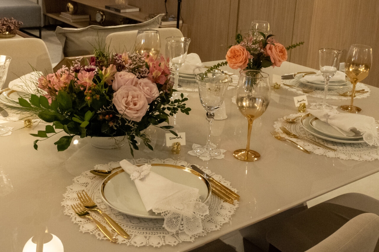 “A ideia para o Blanc é usar o estilo clássico com um toque de modernidade. Para isso, usamos um jogo americano branco e louça de porcelana fina com detalhes dourados, que trazem esse toque de modernidade. Além disso, o uso de flores naturais e coloridas, vai casar com esse estilo clássico e moderno ao mesmo tempo. Uma regra importante para qualquer situação é usar flores naturais. Jamais flores artificiais. Uma mesa sofisticada e elegante se transforma com flores naturais. Também é válido dar preferência por toalhas de mesa ou jogos em tons neutros, o que possibilita o uso de cores nos detalhes”, destaca a decoradora.