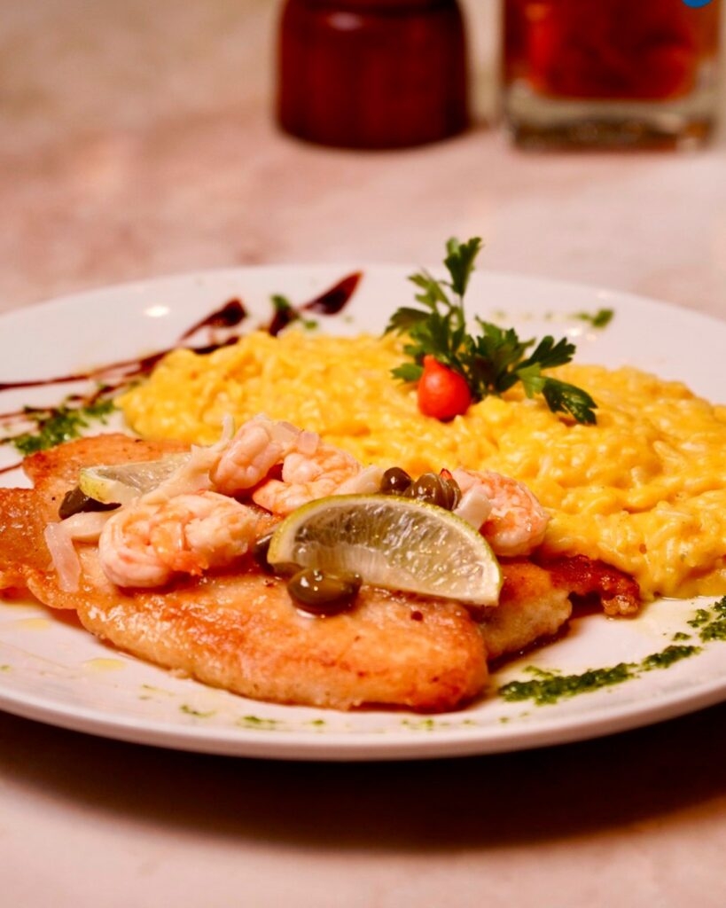 Filé dourado com tomates e azeitonas, com arroz cremoso de manjericão