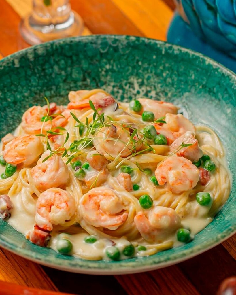 Camarões com bacon, molho bechamel, ervilhas e spaghetti